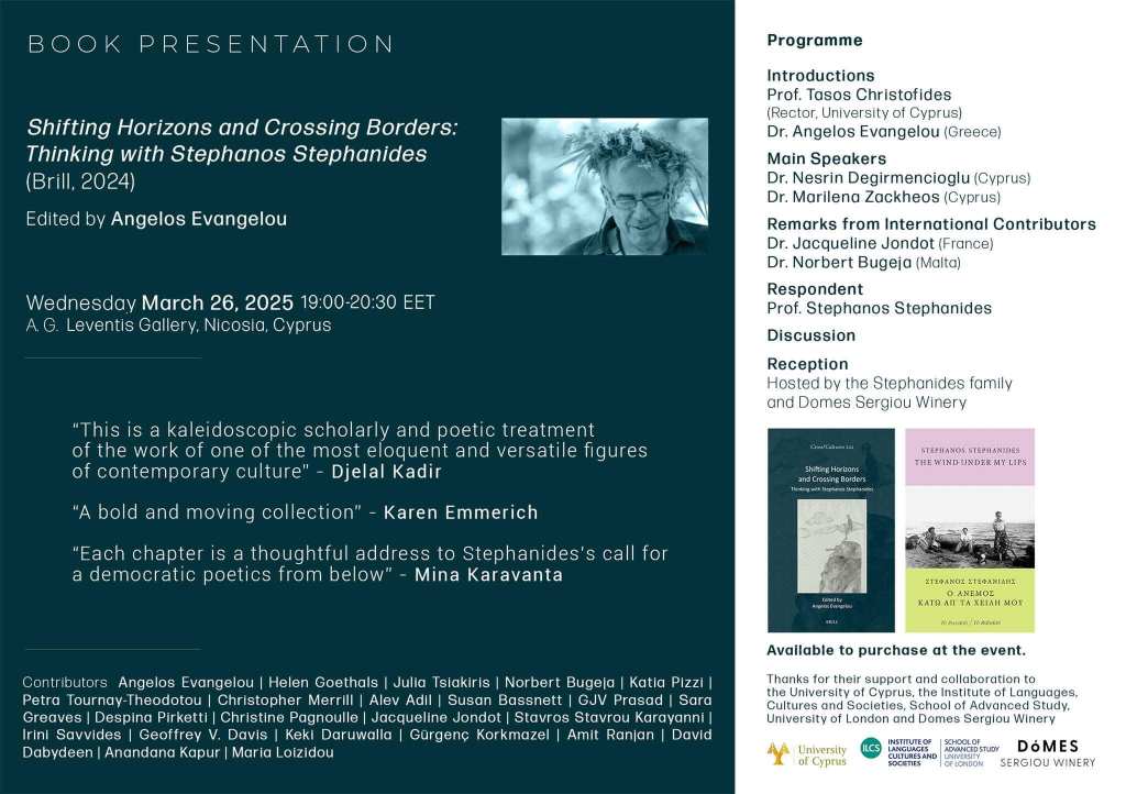 You are warmly invited to the presentation of the edited volume – Shifting Horizons and Crossing Borders: Thinking with Stephanos Stephanides (ed. Angelos Evangelou, Brill, 2024) – which captures key moments in the critical and creative dialogue of literary scholars, poets and artists with poet, author, documentary film-maker and literary scholar Stephanos Stephanides. This will be a live event only.